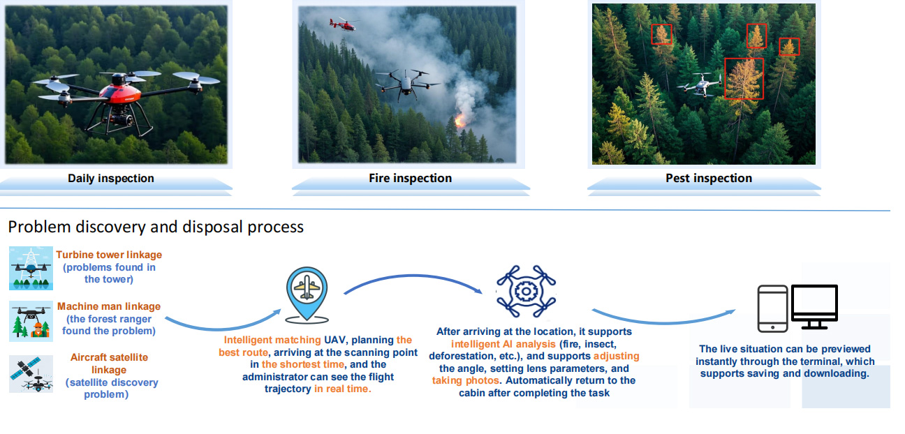 Forestry intelligent inspection service, machine tower linkage weaving sky eye, man-machine collaborative quick response, and full coverage of satellite machine linkage. Daily, fire and insect conditions are under control. Science and technology escort the green forest sea and guard the ecological safety line.