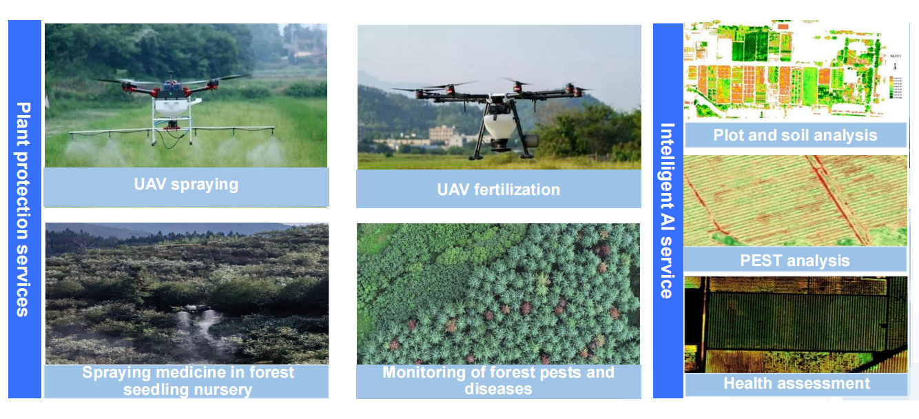 Based on the accurate positioning of Beidou grid code and the intelligent AI service of UAV image, it can efficiently and accurately complete the monitoring of agricultural and forestry diseases and pests, precise fertilization, precise pesticide injection, PEST analysis and other operations, significantly improve the efficiency of agricultural and forestry plant protection, and significantly reduce the labor cost and environmental pollution.